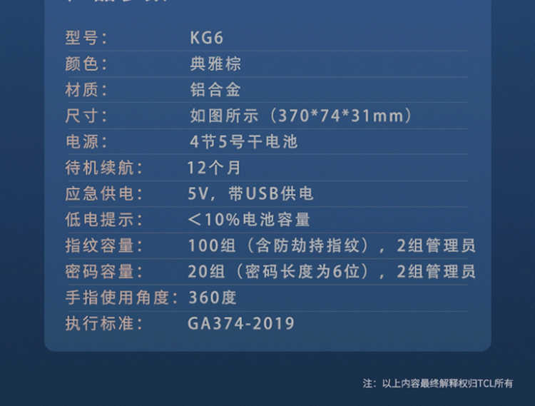 TCL指纹锁智能锁家用防盗门锁 可以APP/指纹/密码/钥匙/卡开门 配带锁体KG6