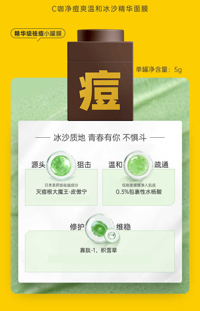 C咖清洁祛痘熬夜补水舒缓精华面膜组合 【山茶花解渴微凝珠+白泥清透净肤+净痘爽温和冰沙+蜂王浆熬夜嗨温感+积雪草舒缓修护】
