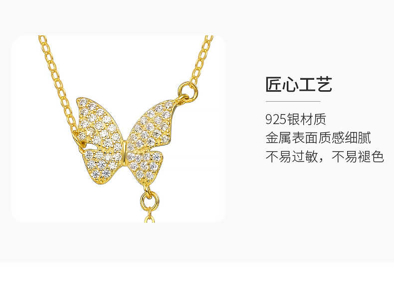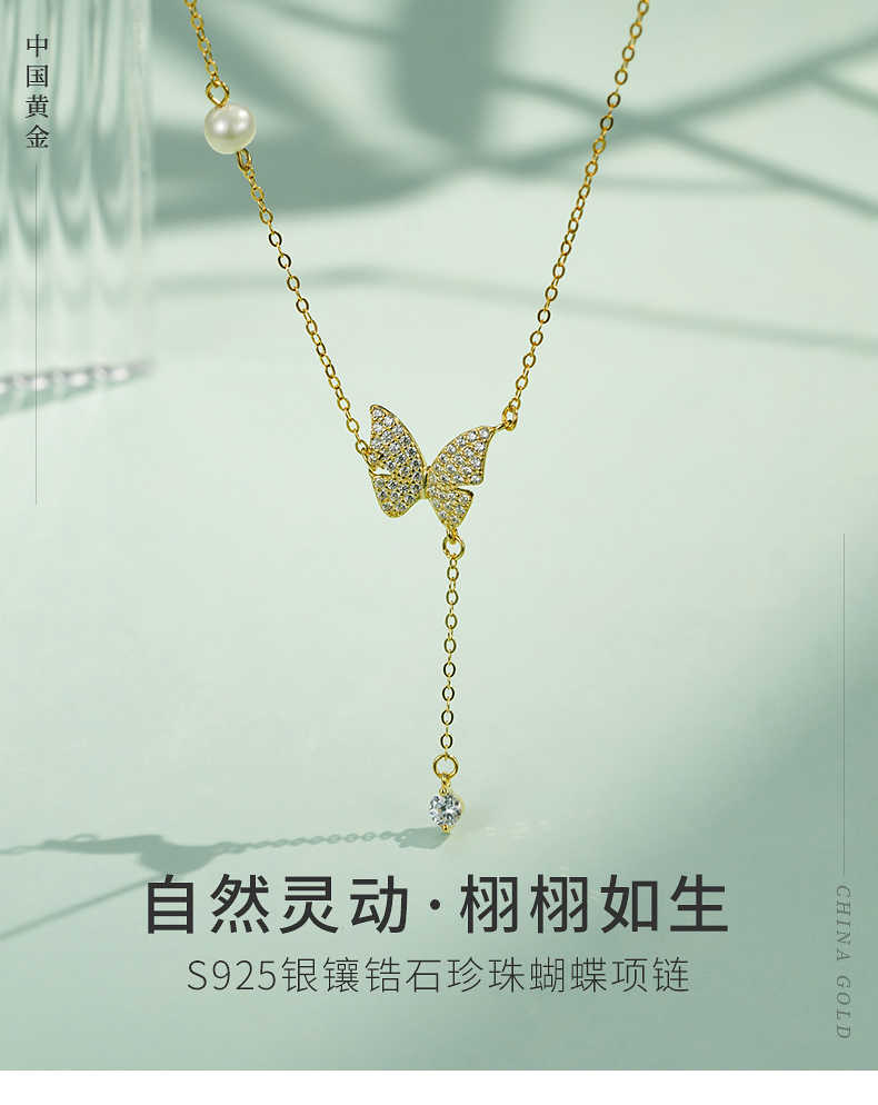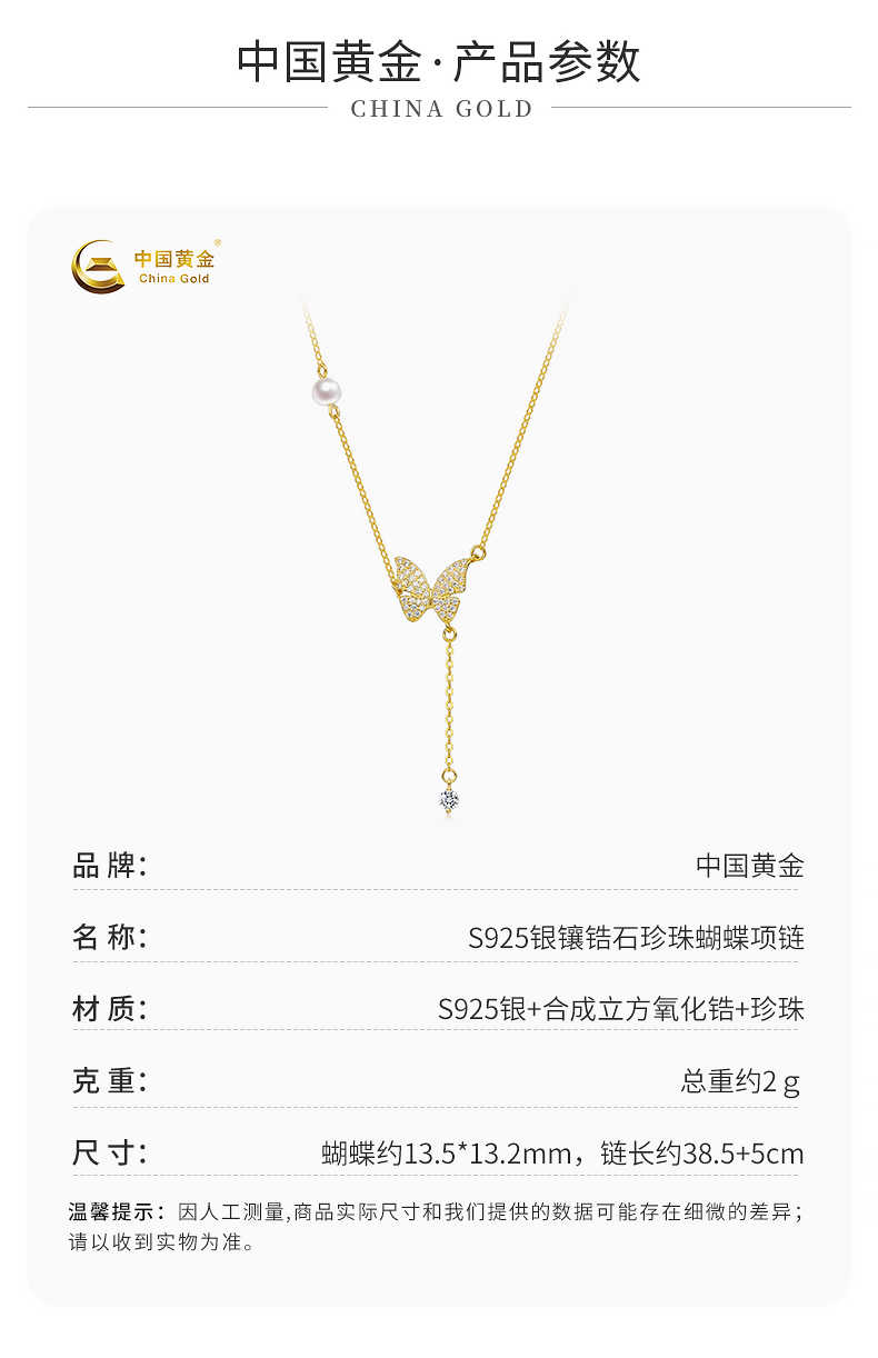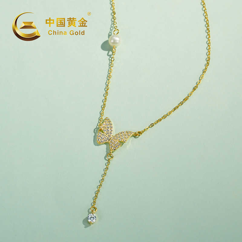 包邮-中国黄金 S925银镶锆石珍珠蝴蝶项链镀金色ZGHJ220585 (支持线下验货)【新疆西藏不发货】