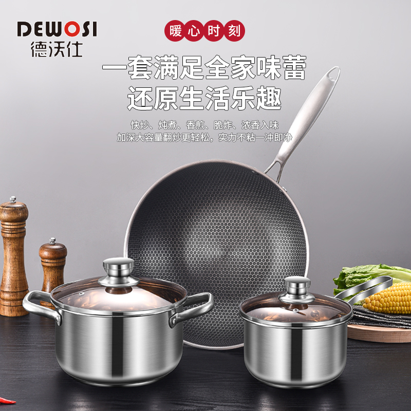 德沃仕 食品级不锈钢炒锅三件套 蜂窝悬浮不粘炒锅 汤锅 炖锅 炒锅 三件套