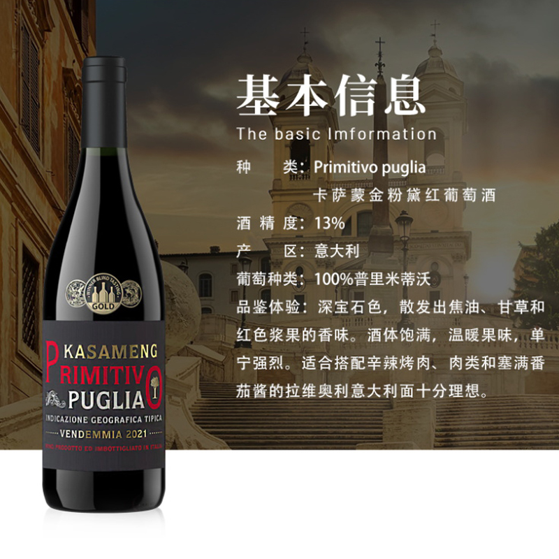 意大利原瓶进口卡萨蒙金粉黛红葡萄酒750ml * 6瓶