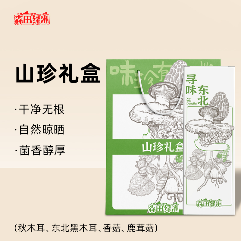 森田绿洲山珍礼盒干净无根自然晾晒菌香醇厚0添加食材享受自然美味长白山源头甄选山珍蘑菇木耳礼盒360g【秋木耳100g+东北黑木耳100g+香菇80g+鹿茸菇80g】