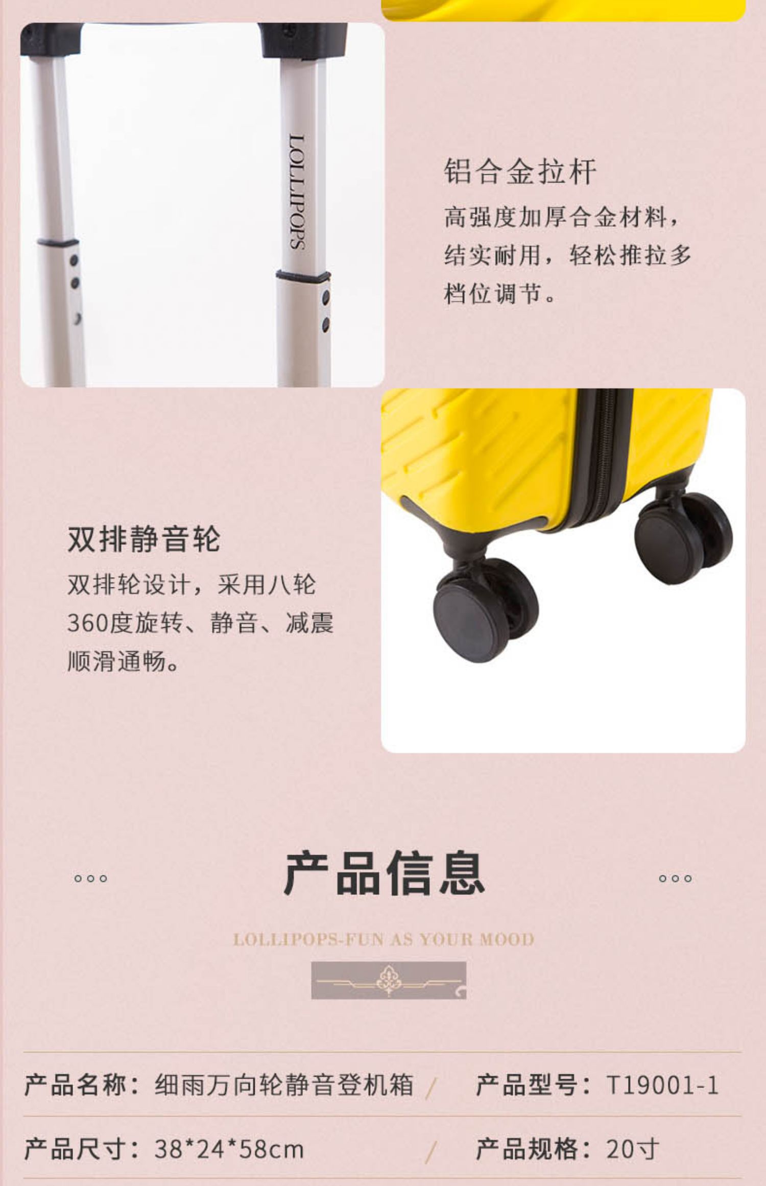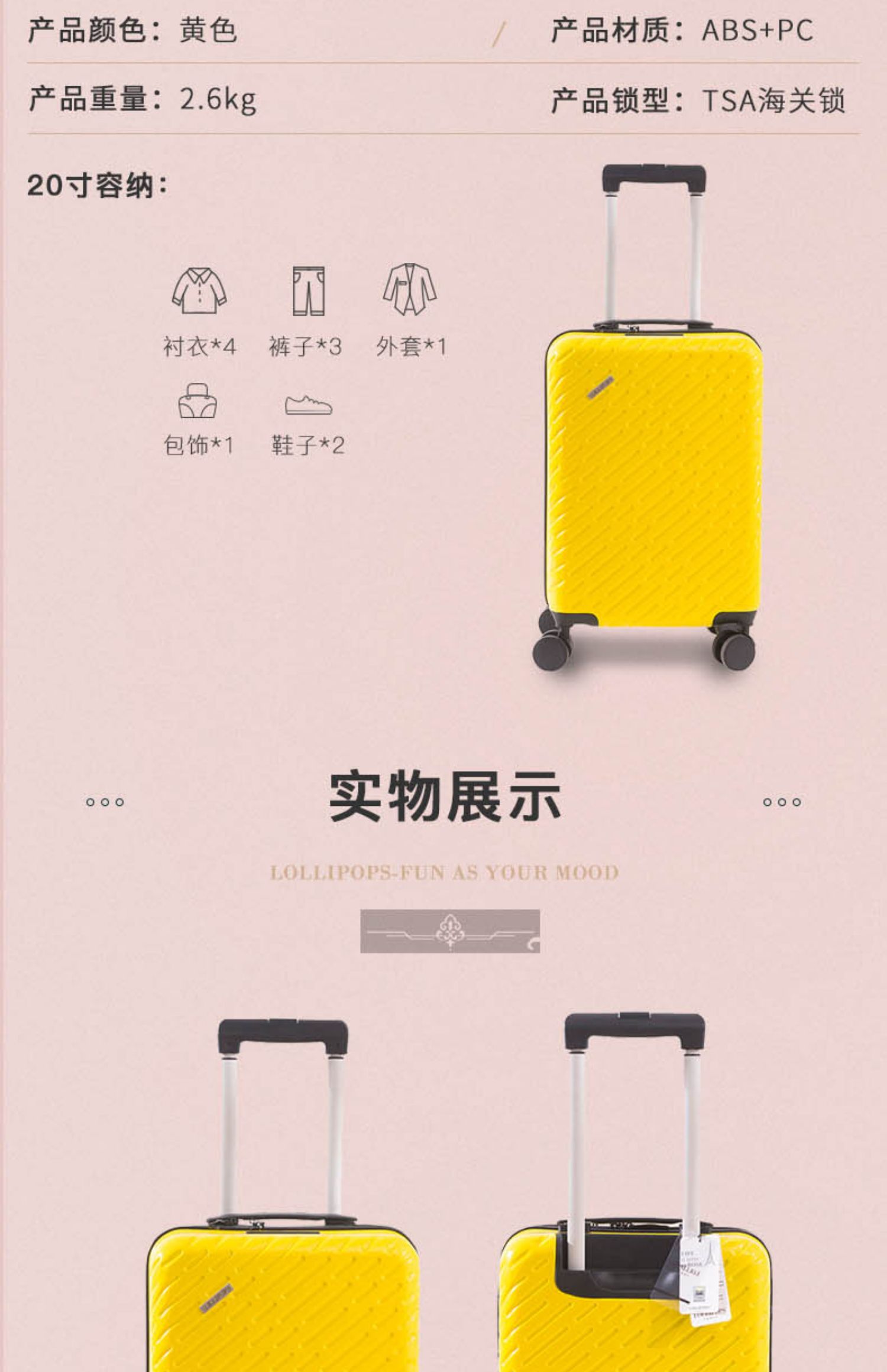 lollipops旅行箱20寸小型箱万向轮拉杆箱男行李箱女登机箱密码箱【防泼水、大容量、防刮耐磨、分层收纳】【T19002 黄色款】【T19007 苹果绿】