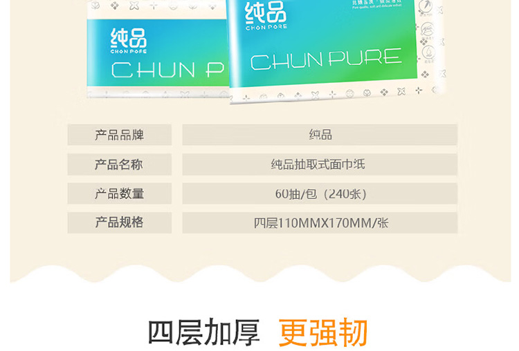 纯品抽纸 绒柔本色 竹浆4层 天然无香【30包*240张】60抽/包 包邮