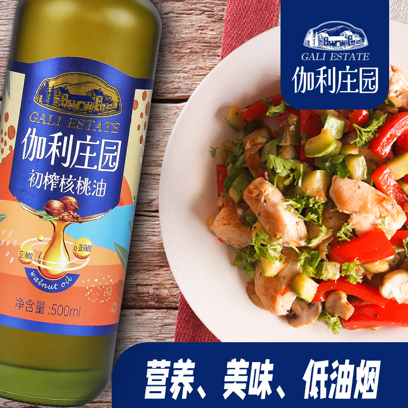 伽利庄园有机初榨100%纯核桃油恒温精制压榨送婴幼儿宝宝辅食高端礼盒500ml*2瓶/盒
