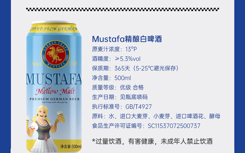 啤酒1箱 Mustafa 慕尼黑精酿啤酒5.3度 500ml/罐 12瓶/箱