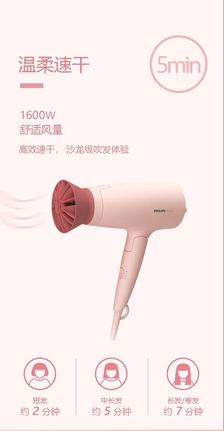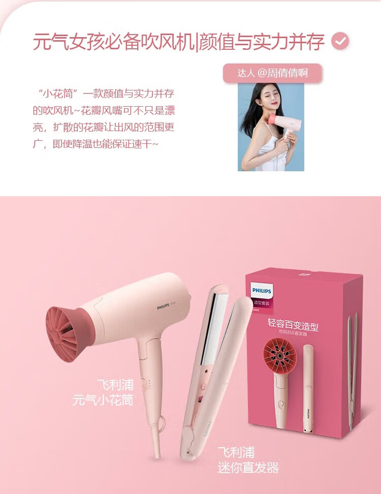 飞利浦小花筒电吹风家用大功率 负离子吹风筒恒温护发 BHP398 带直发器 吹风造型套装【吹风机BHD308+直发器HP8401】