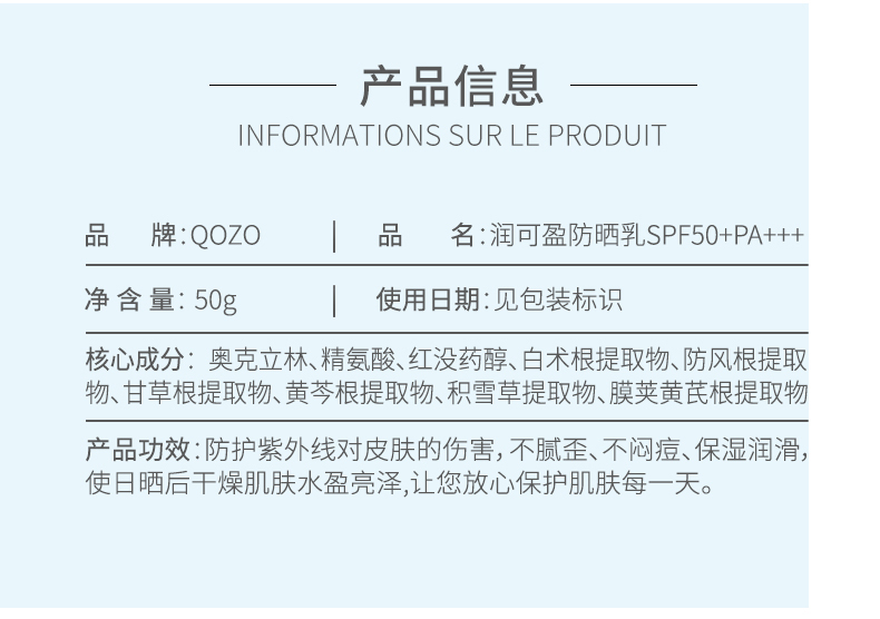 QOZO润可盈防晒乳SPF50+PA+++