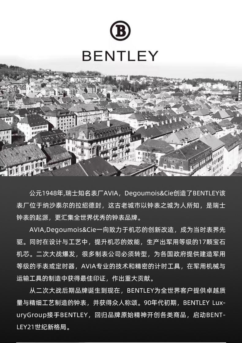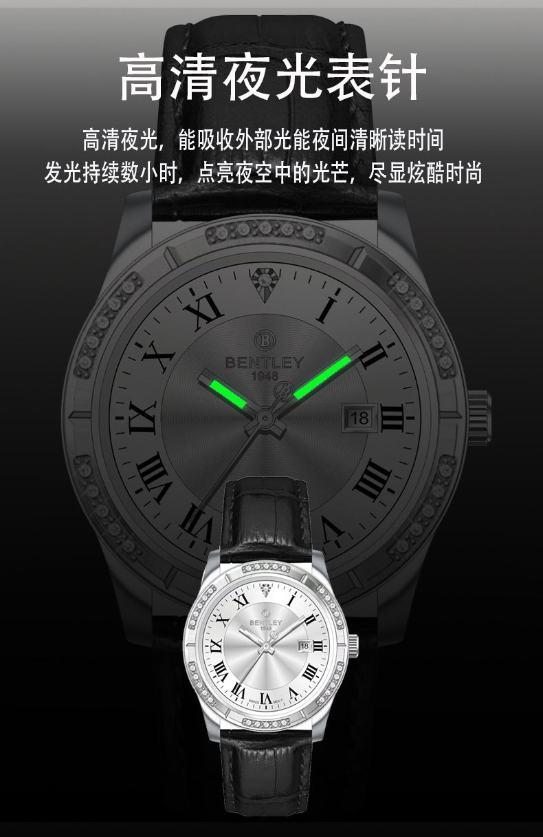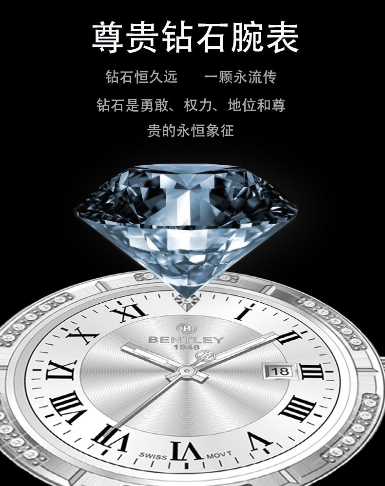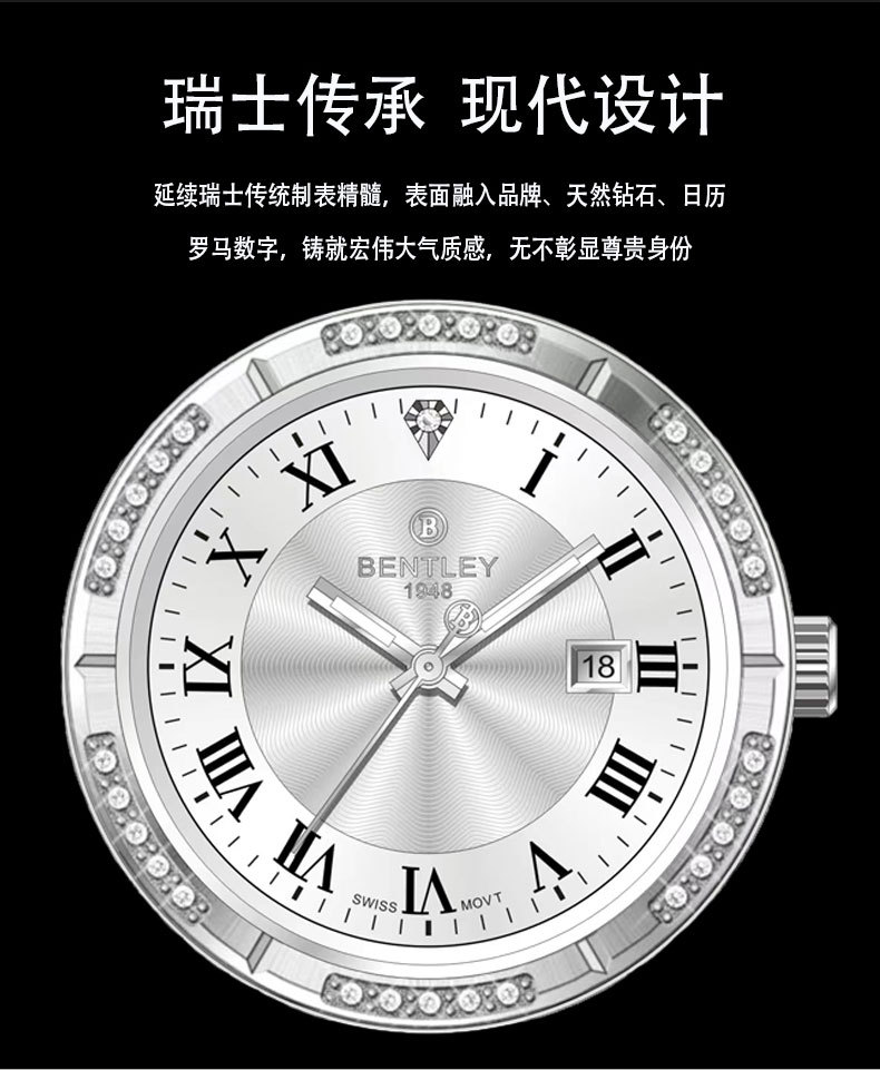 【专柜同款】宾利男士商务时尚手表瑞士原装机芯天然钻石男士腕表