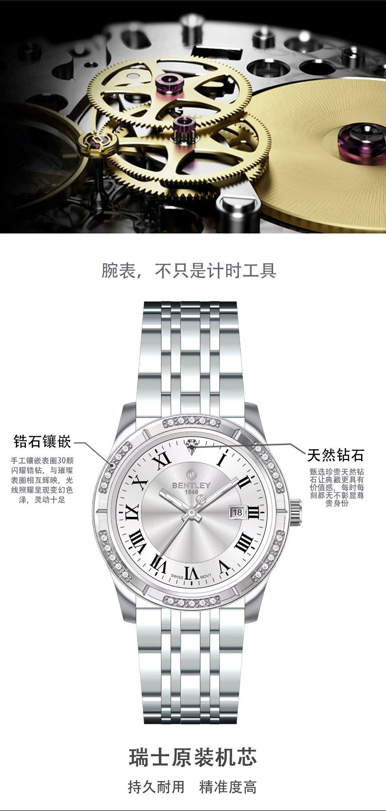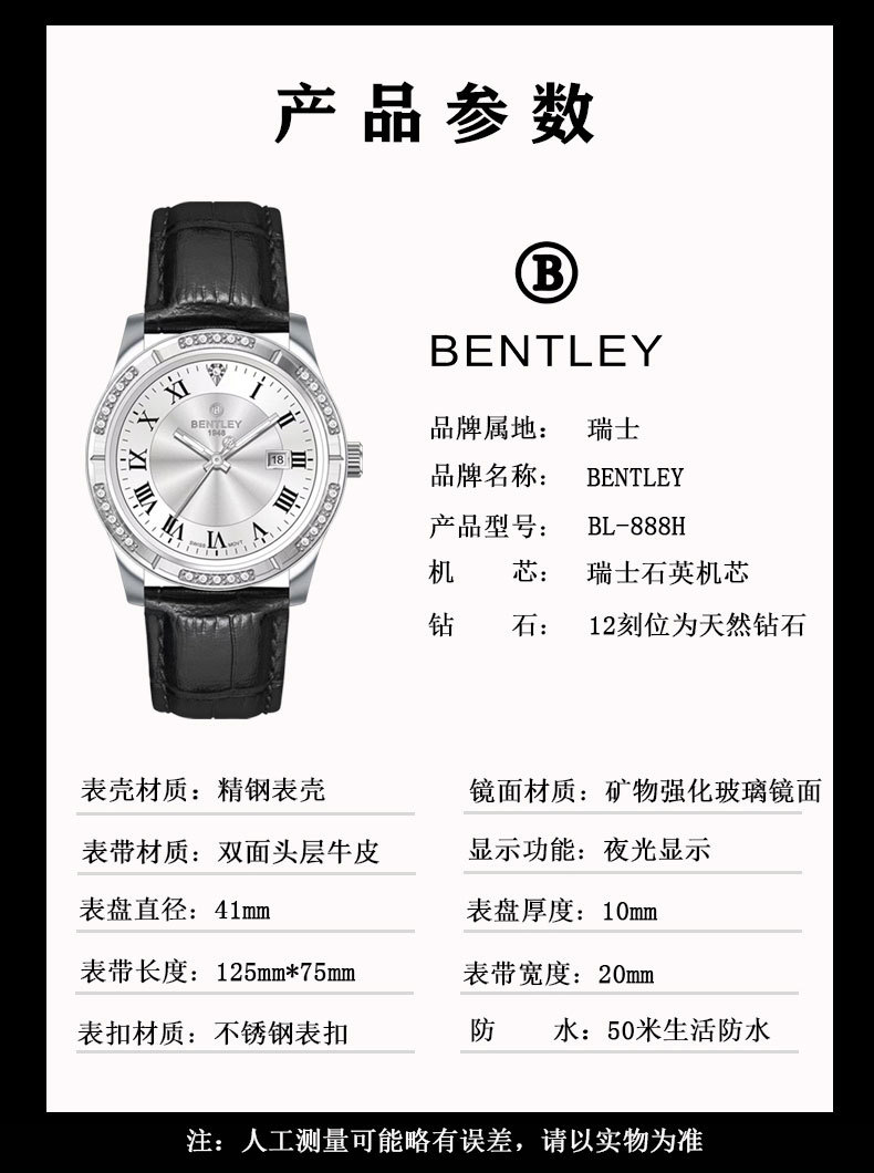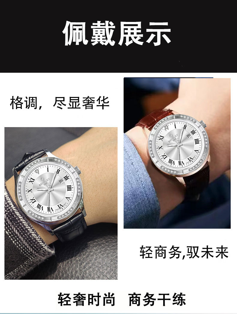 【专柜同款】宾利男士商务时尚手表瑞士原装机芯天然钻石男士腕表