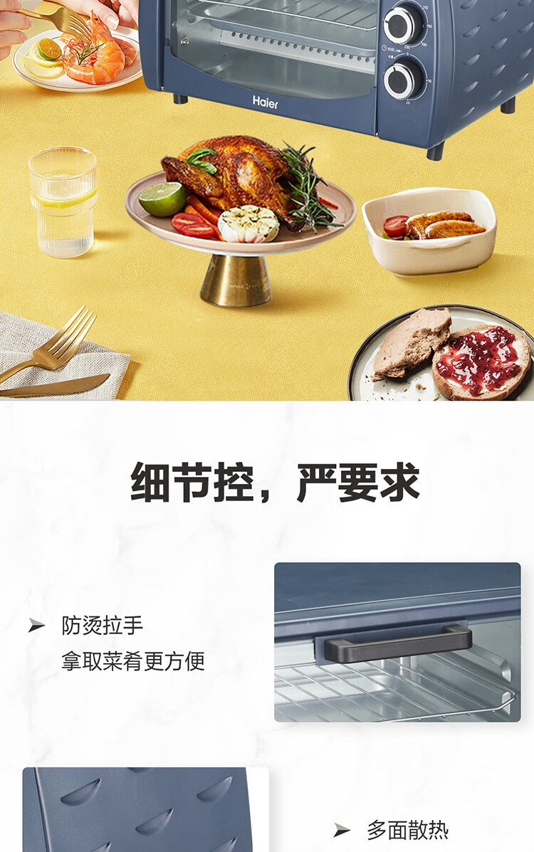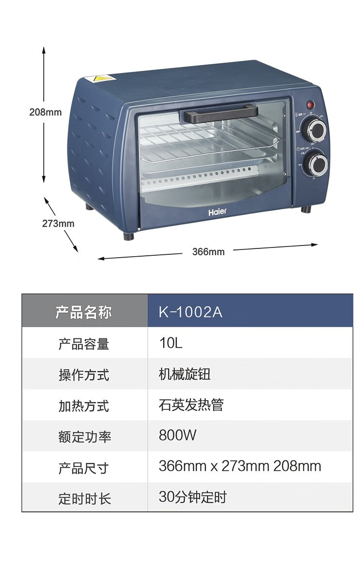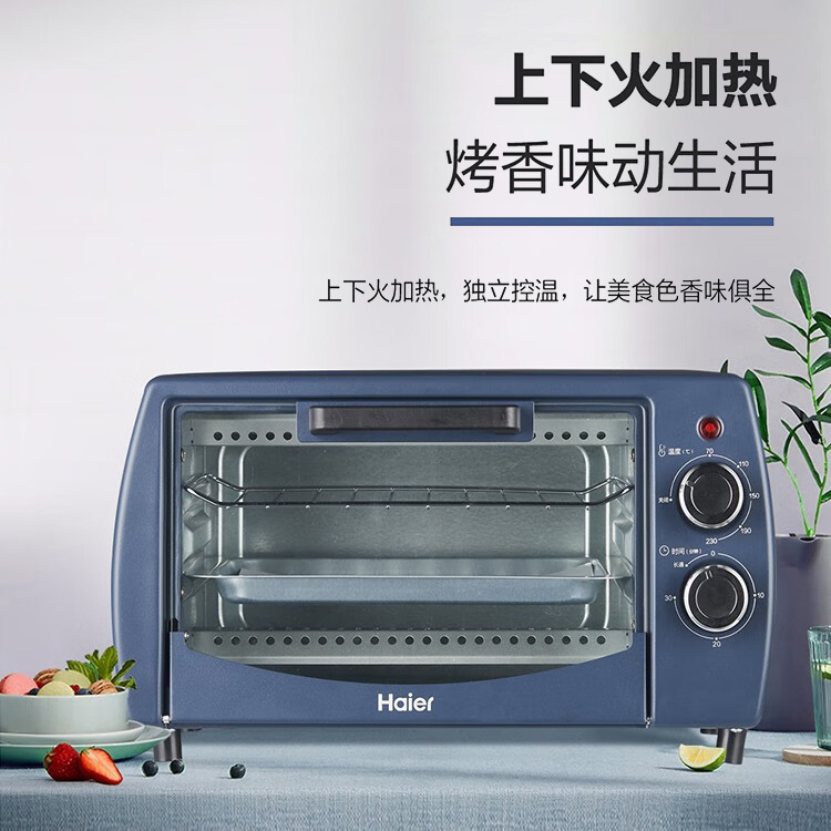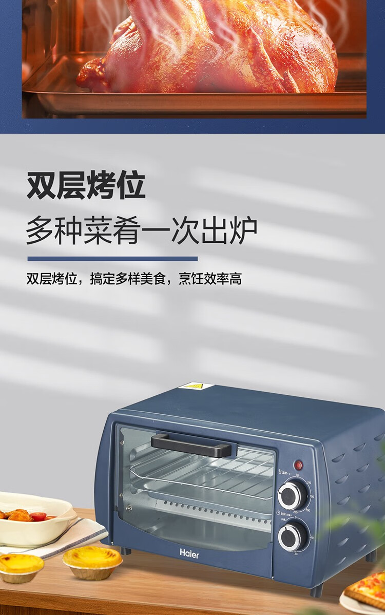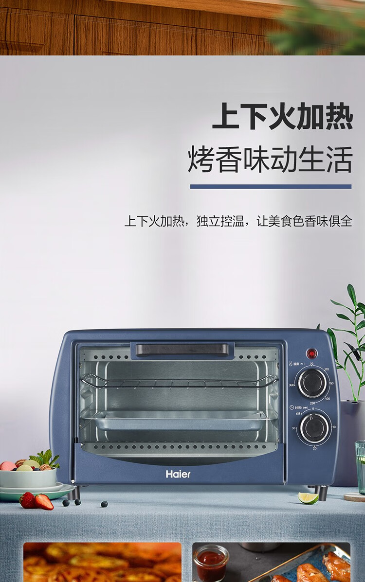 海尔 Haier 家用多功能电烤箱一机多用小巧外观 家用烘焙蛋糕蛋挞早餐机 双旋钮控制家用烤箱 K-1002A 蓝色
