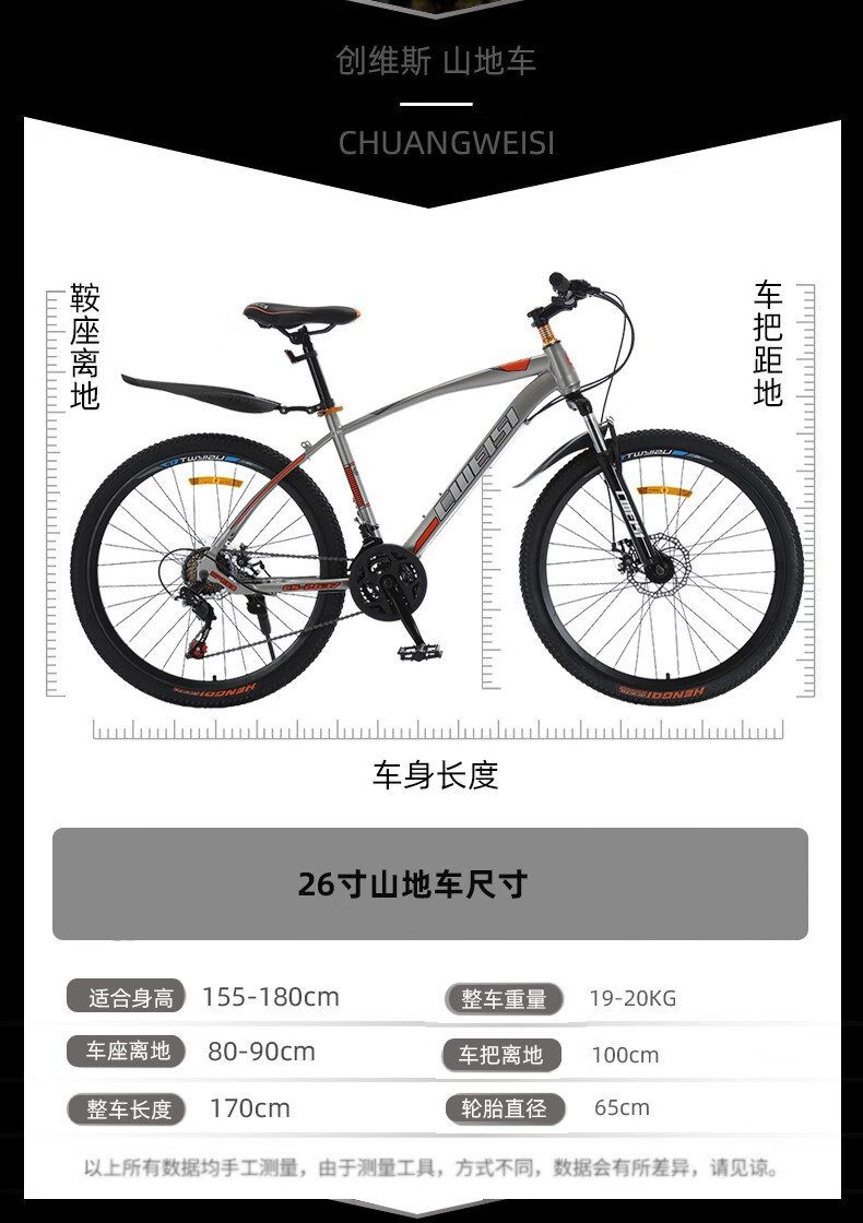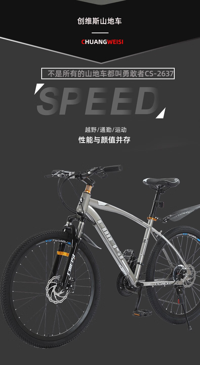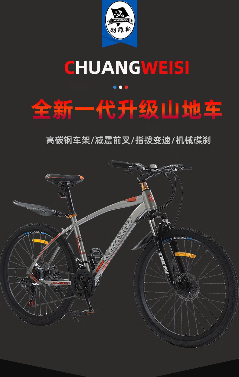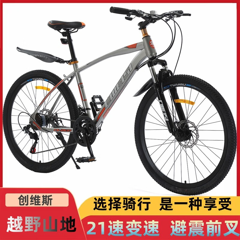 【骑行必备,3折抢购】创维斯 26寸高碳钢山地自行车 单车山地车自行车山地车户外骑行双碟刹减震单车学生成人男女公路车 26寸三色可选(白蓝色/黑蓝色/黑红色) 下单请备注所需颜色款式 21速 包邮部分地区除外