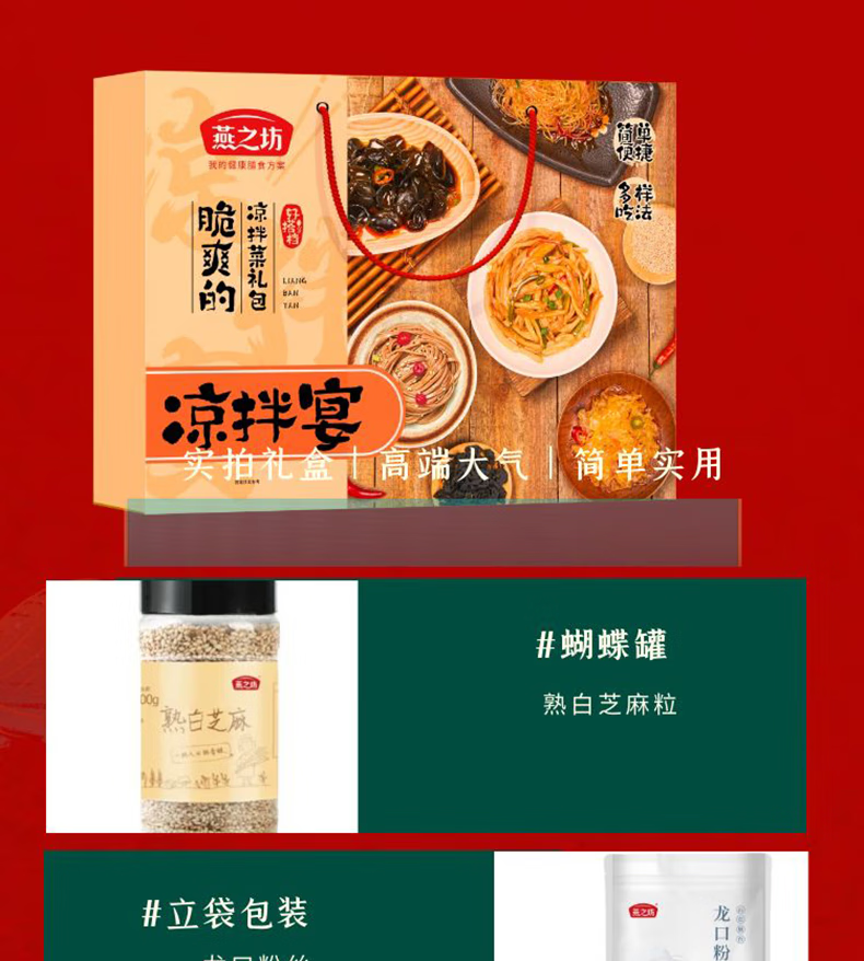 燕之坊凉拌宴干货礼盒1012g【黄花菜80g 雪花银耳66g 龙口粉丝200g 长白山秋耳66g 黑麦荞麦杂粮挂面200g*2 熟白芝麻200g/罐】【新疆/西藏/海南/内蒙/宁夏/青海/甘肃/港澳台不发货】