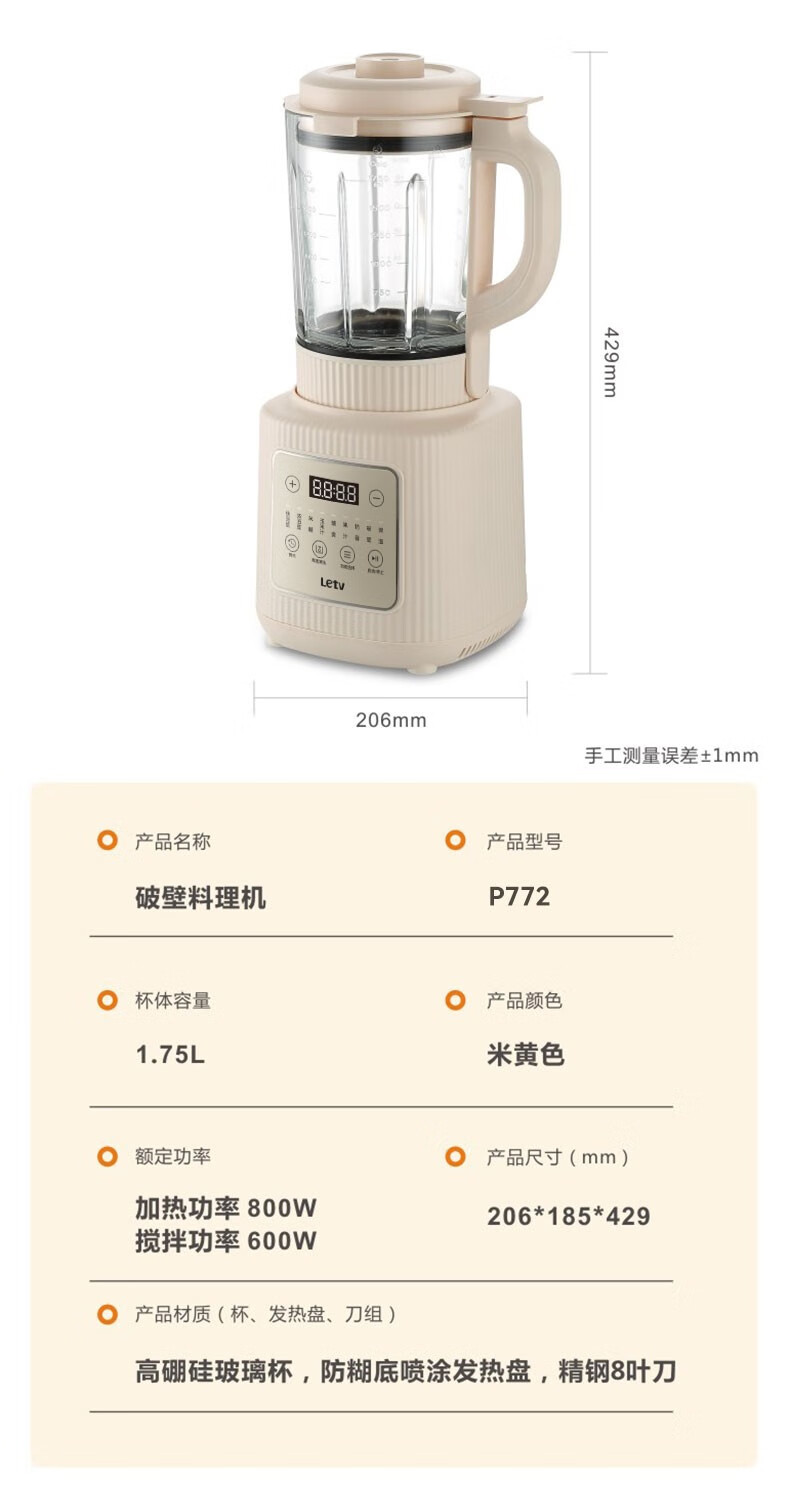 乐视Letv 破壁料理机1.75L P772 高速破壁多功能豆浆辅食果汁奶昔