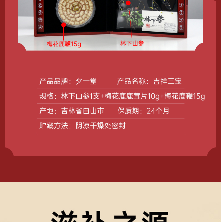夕一堂 吉祥三宝礼盒装 长白山15年以上林下山参1支+梅花鹿鹿茸片10g+梅花鹿鞭15g 滋补营养品 中秋送礼佳品 初级农产品