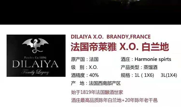 法国原瓶进口洋酒珍藏级帝莱雅XO白兰地1L(内蒙古不发货)