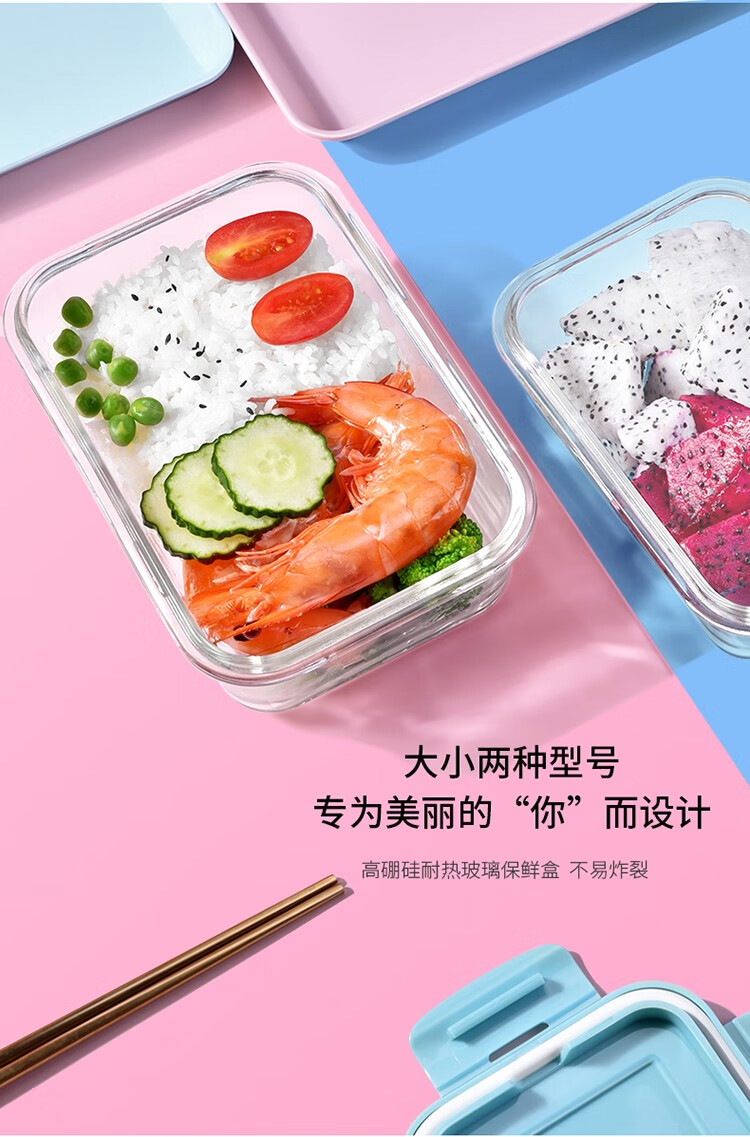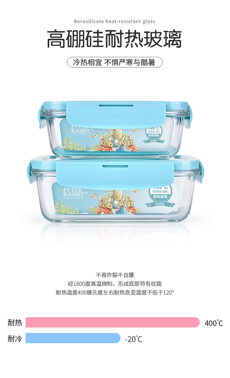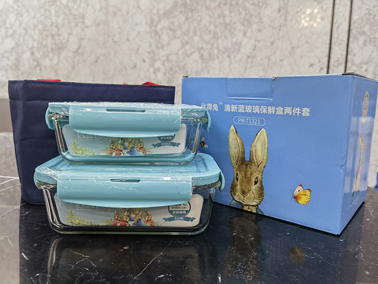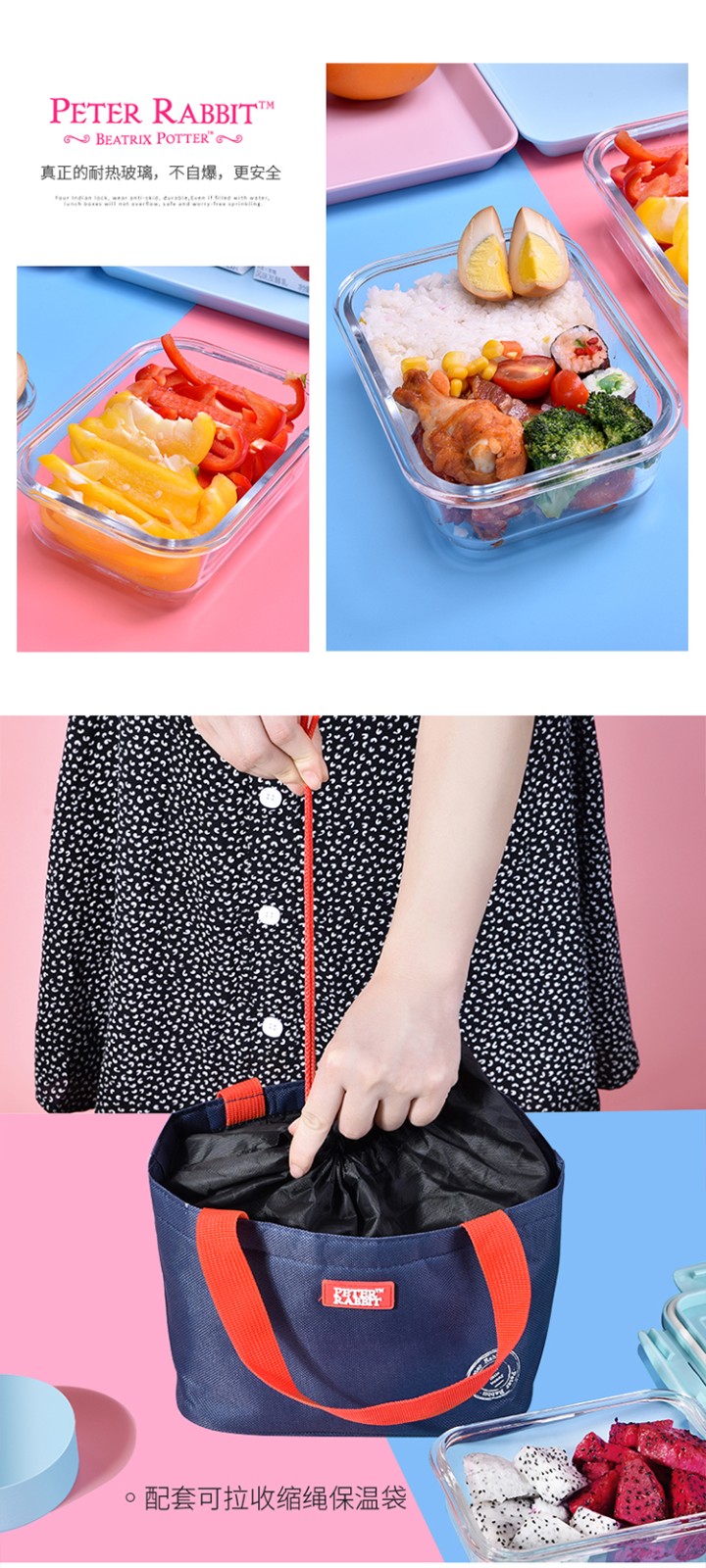 比得兔玻璃保鲜盒 微波炉密封盒便当盒带饭盒套装饺子盒冰箱收纳保鲜盒两件套+餐包PR-T1321